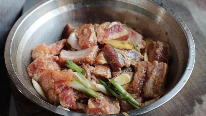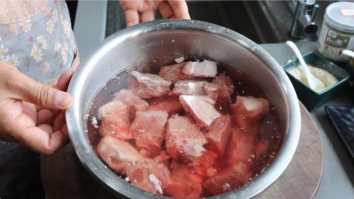 買回來的新鮮排骨不要焯水,先用涼水浸泡2個小時,泡出排骨裡的血水,這樣處理的排骨吃著才不會有腥味。