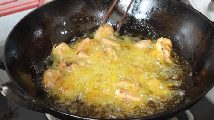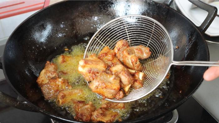一直將排骨炸熟、炸到顏色焦黃的時候就可以控油撈出來了,這個時間大概是7-10分鐘。