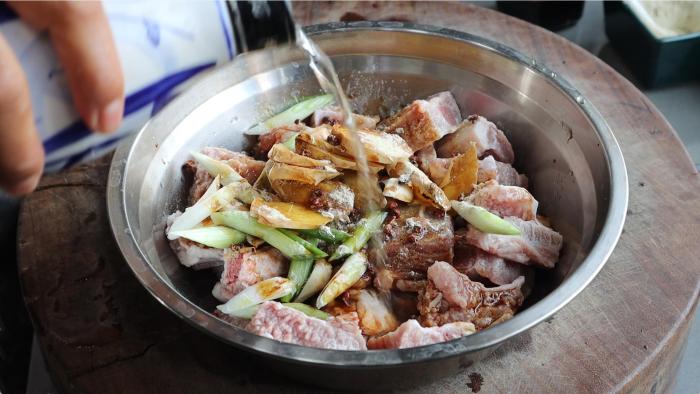 排骨泡出來血水後沖洗沖洗,將上面沾的血水和骨頭渣沖洗乾淨,再控幹水分。
