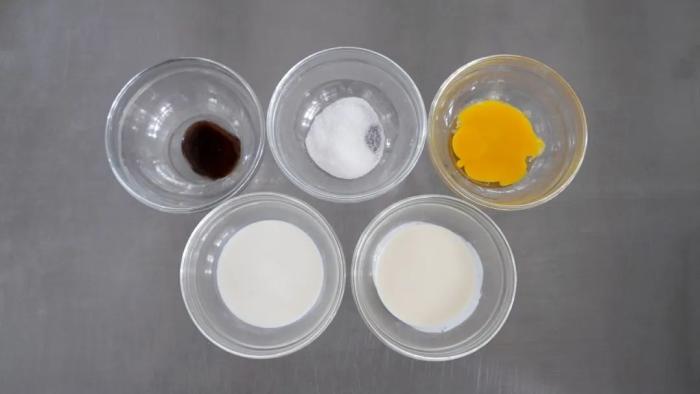 - 牛奶和糖攪拌至糖化,加入淡奶油攪拌均勻,加入蛋黃香草醬攪拌均勻,過篩,灌入模具9分滿
