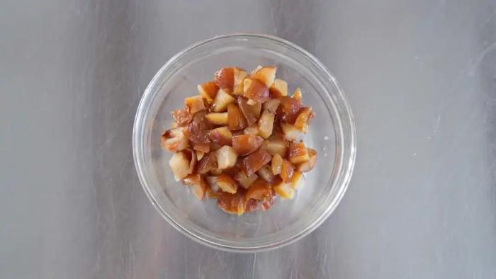熟栗子切丁備用,大小跟提子乾大小相近