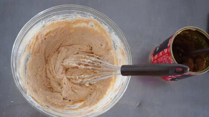 - 加入淡奶油攪拌均勻,加入低粉泡打粉攪拌均勻,加入栗子泥攪拌均勻