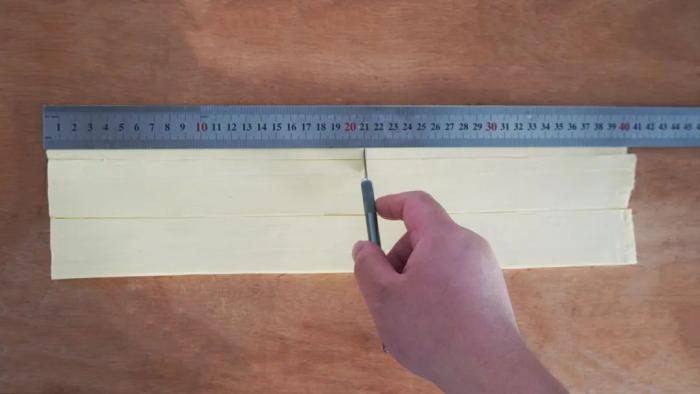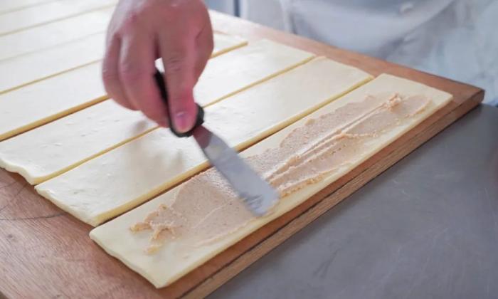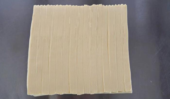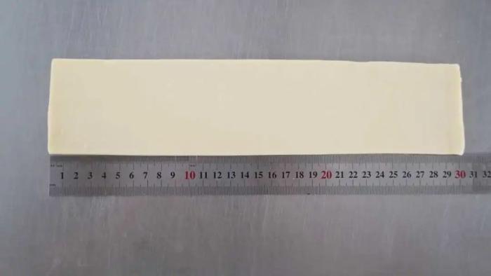 - 麵糰壓至30cm寬,4mm厚度,裁剪成7cmx30cm尺寸