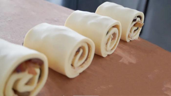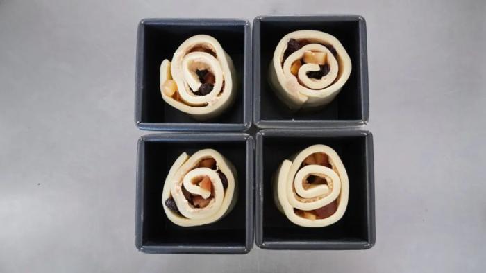 - 抹上栗子奶酥餡,放酒漬提子乾,熟栗子丁,捲起,放入模具