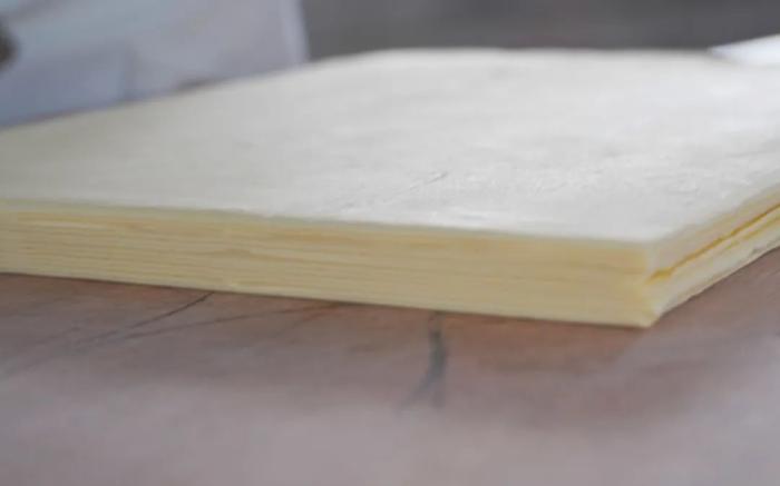 - 明酥:壓成30cmx30cm尺寸,從側邊切2mm後,貼在表面,冷凍鬆弛20分鐘,壓至4mm厚度